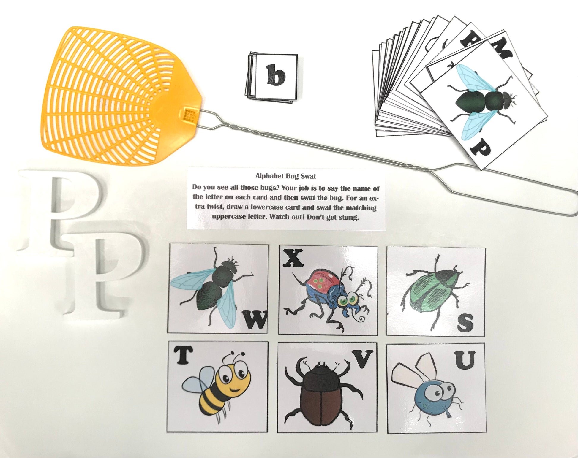 This game is perfect for any active learner who is ready to identify their letters. Lay the bugs out on the floor or use painters tape to stick them to the wall. Then draw a lowercase letter card and go and swat the matching uppercase letter bug. We have used this game indoors and outdoors. With painters tape the bugs stick perfectly to the garage door or to vinyl siding. What kid doesn’t love to use a flyswatter to get a bug?
