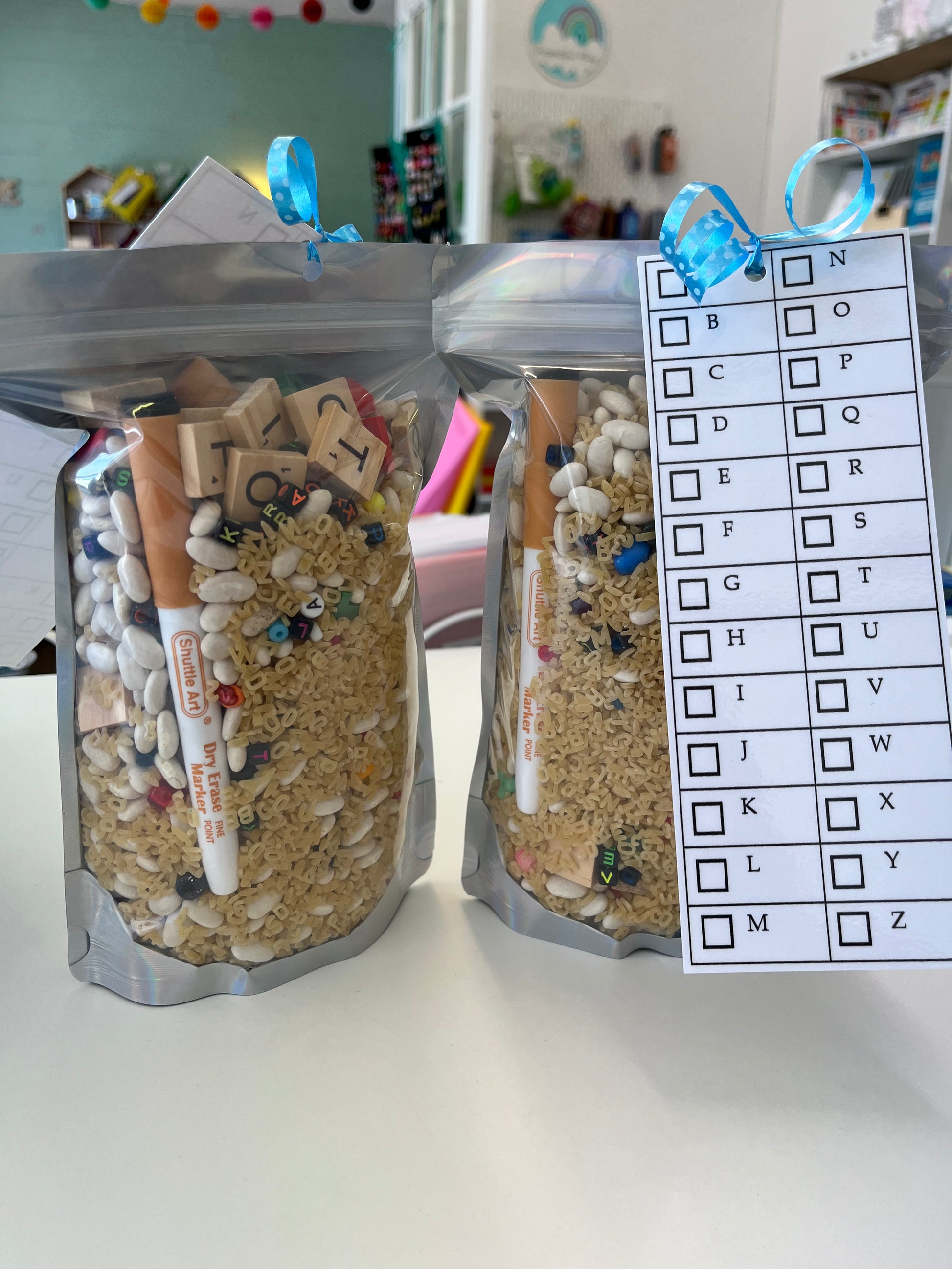 Here’s a fun and easy way to practice letter identification while engaging the senses. Simply dump into a pan or bowl. Includes scoop and dry erase marker as well.