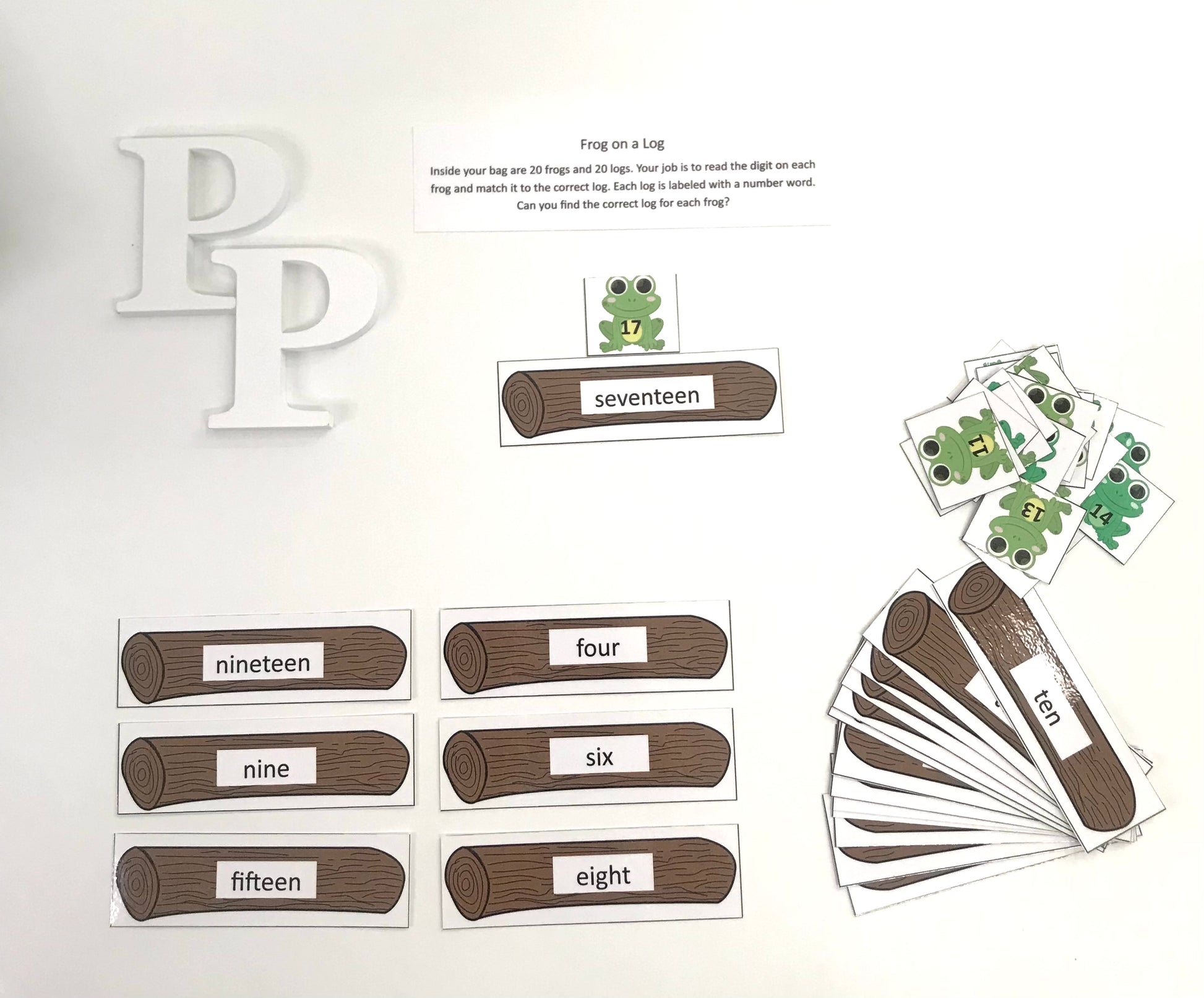 In this activity the logs have the number word written on it and the frogs have the digit. Your job is to select a number log and find the matching frog to go on top. All pieces are laminated and cut out. This activity comes in a busy bag. It includes numbers 1 through 20.