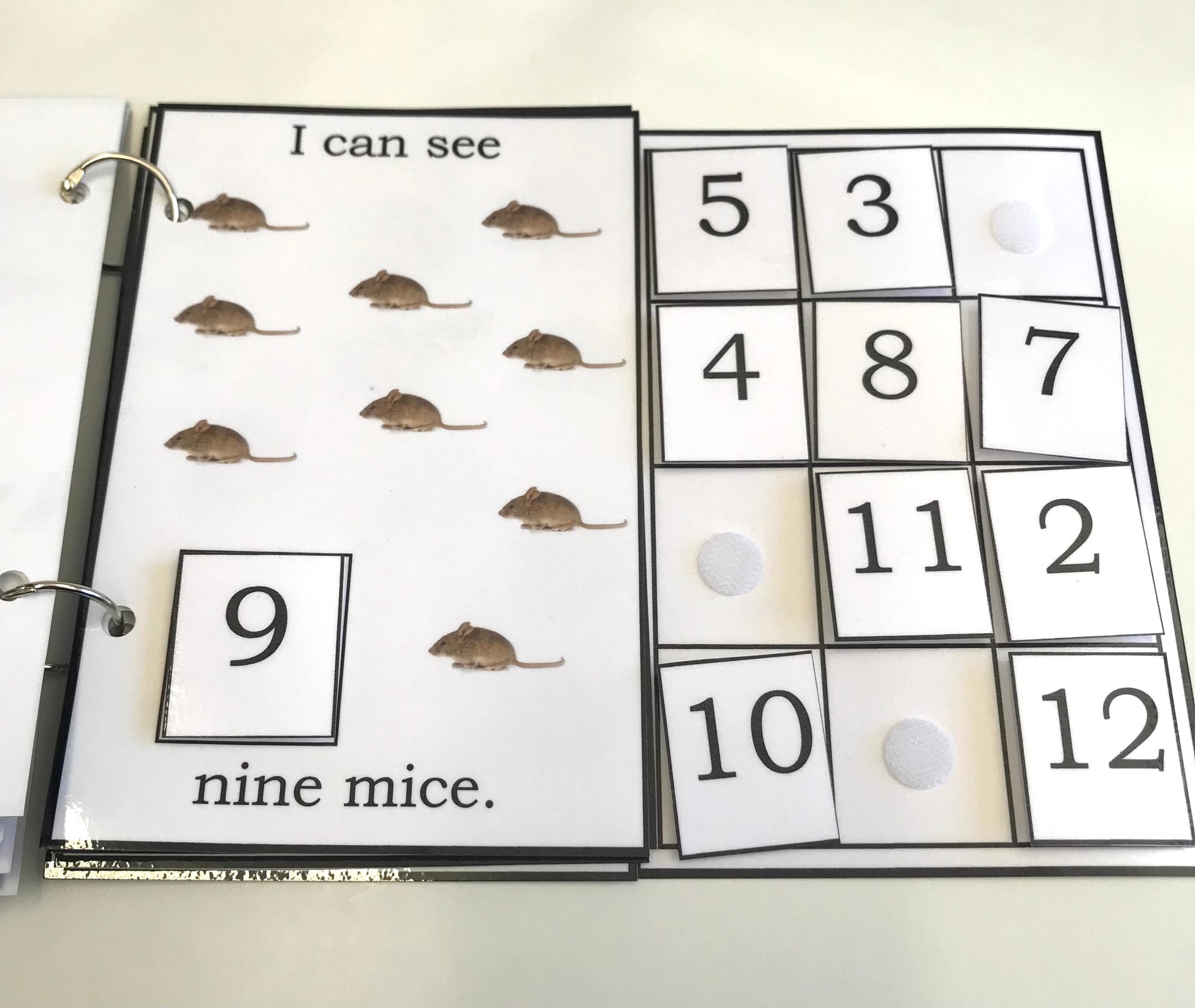 Work on one to one correspondence and recognizing numbers with this repetitive interactive book. Includes a page for numbers 1-12. All pages are laminated and book comes fully assembled. Pieces are attached with Velcro dots.
