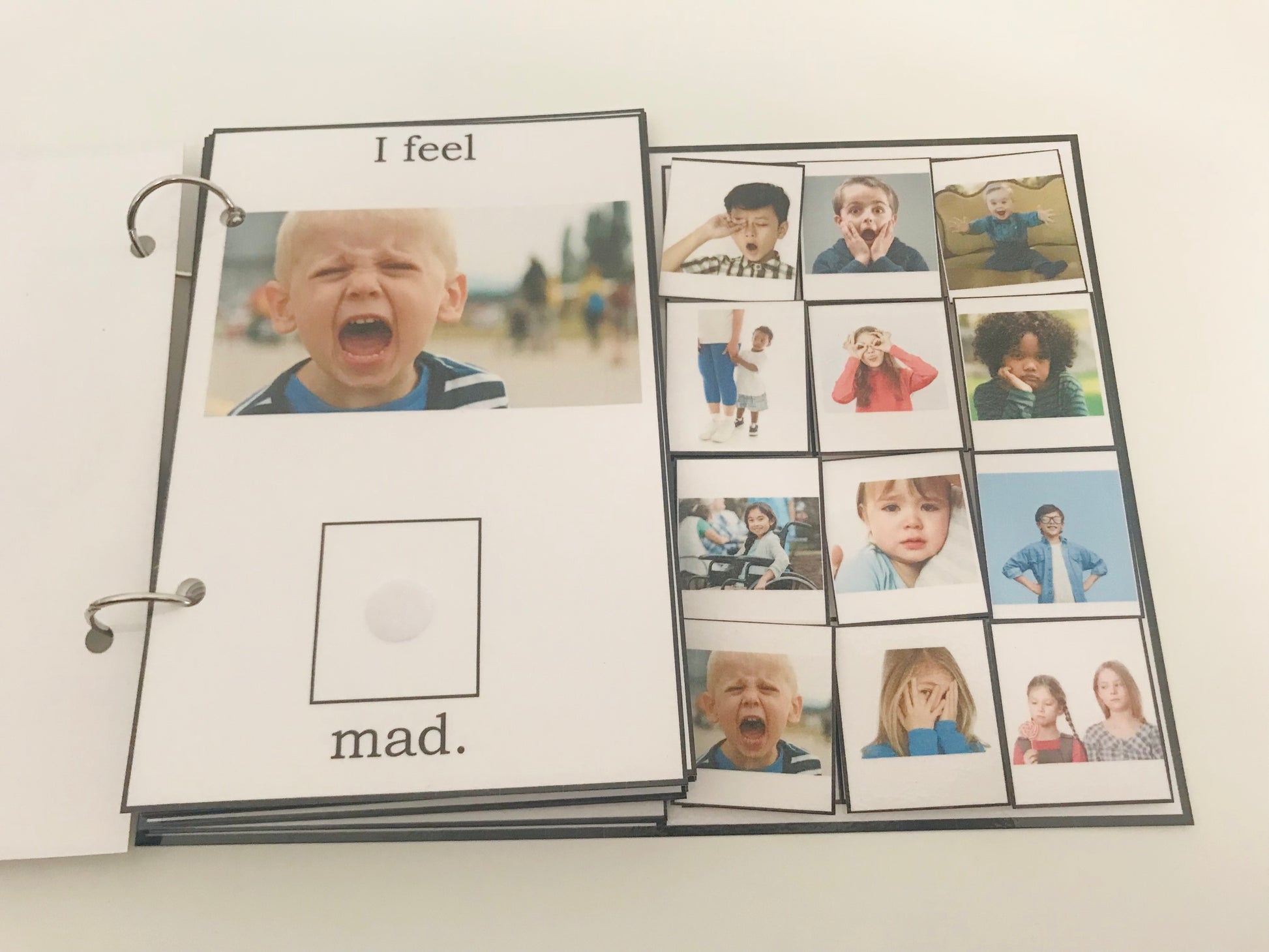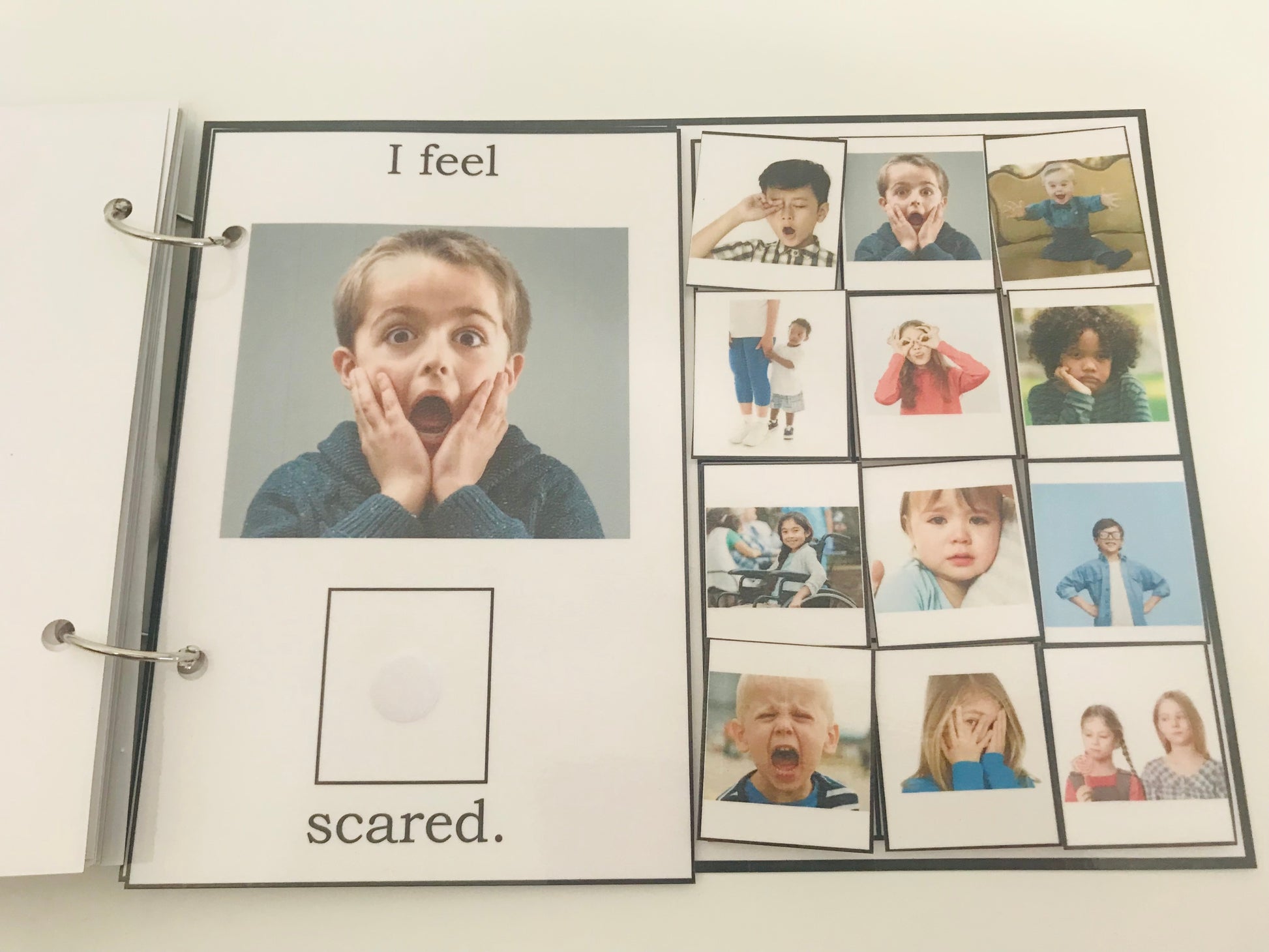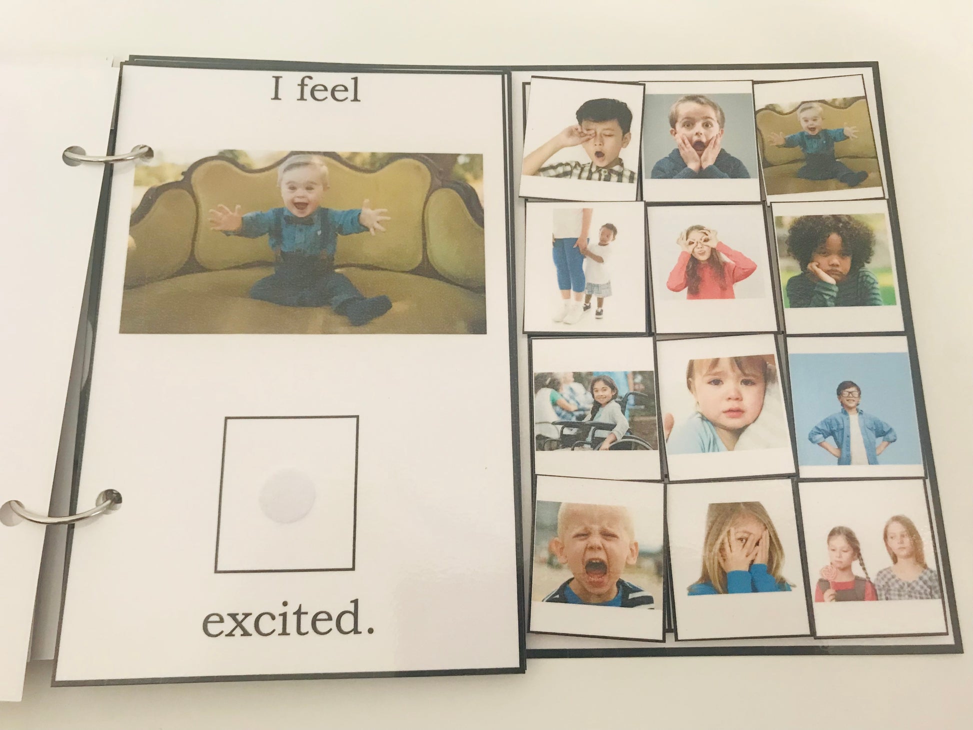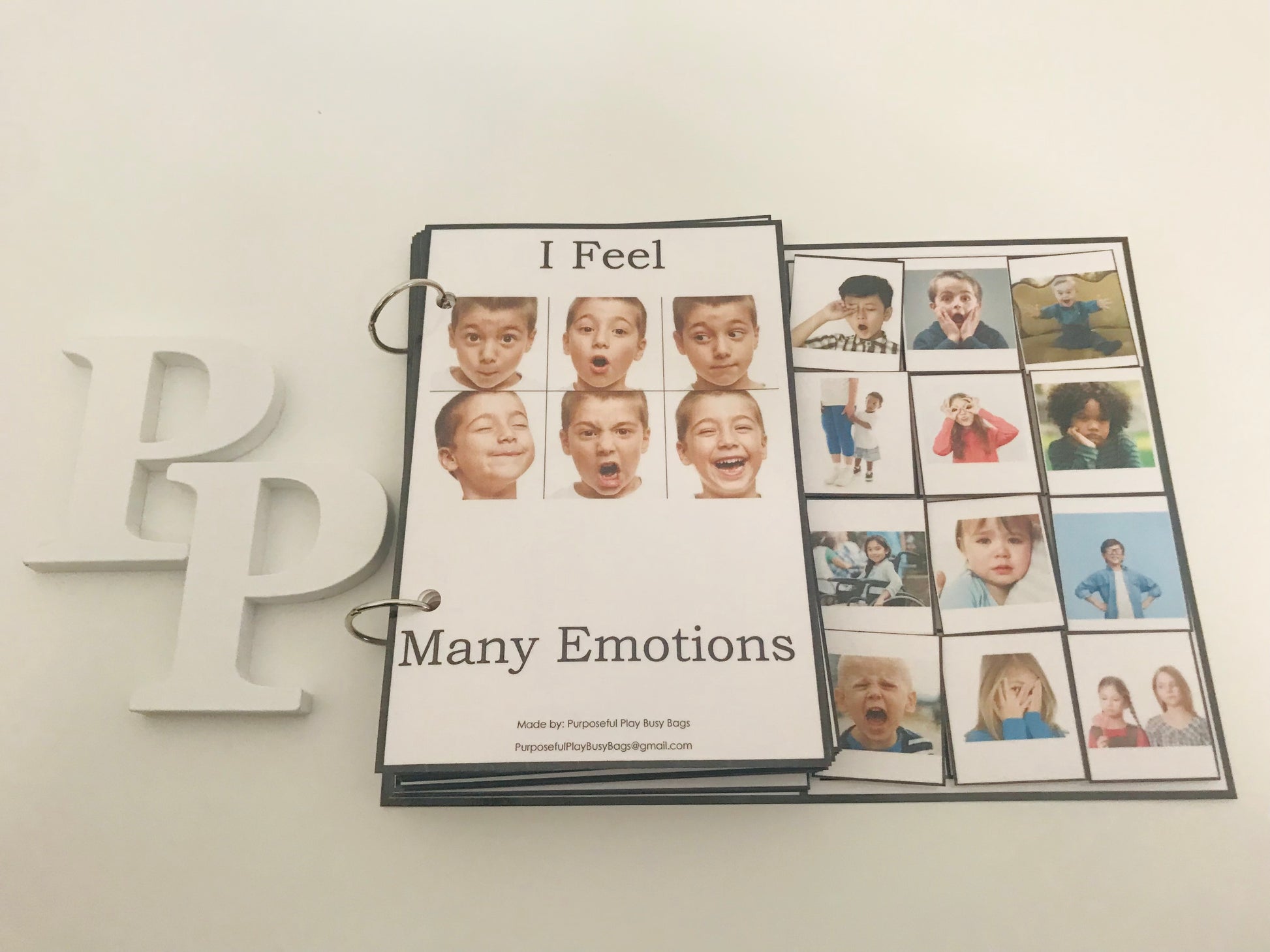 This interactive book was designed to help your child be able to identify different emotions that they feel and develop early reading skills. The book has repetitive language and a picture on each page for matching. The book comes fully laminated and assembled. The pieces connect with Velcro dots, and it is bound with metal rings.