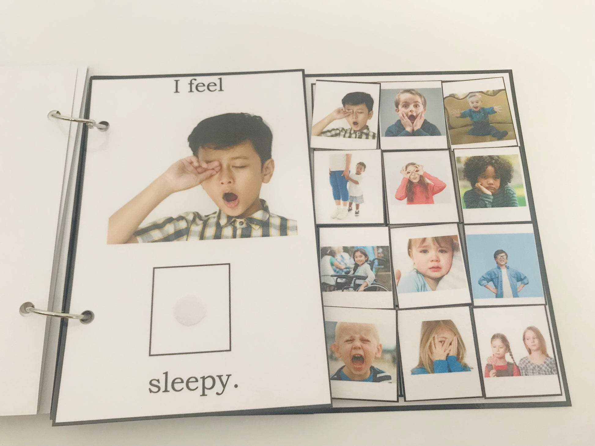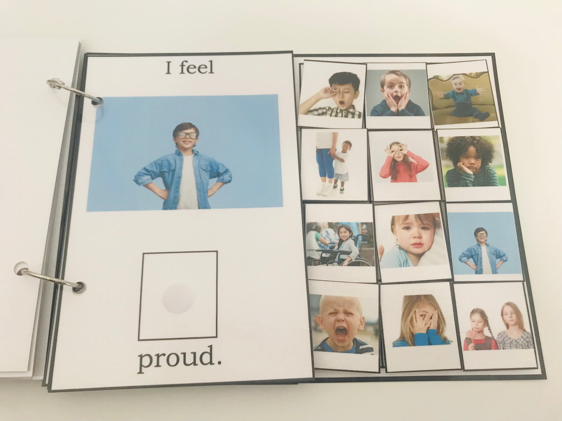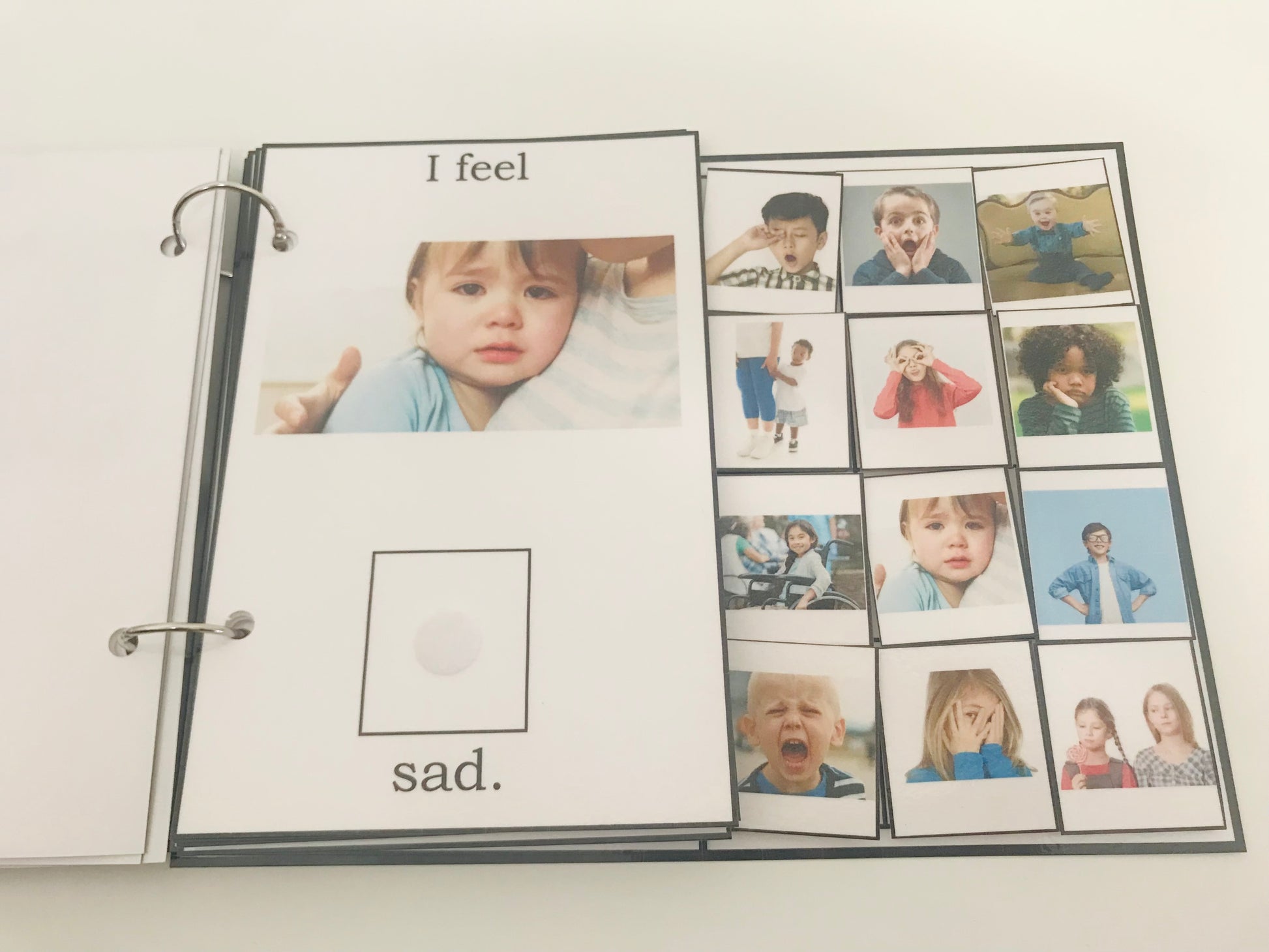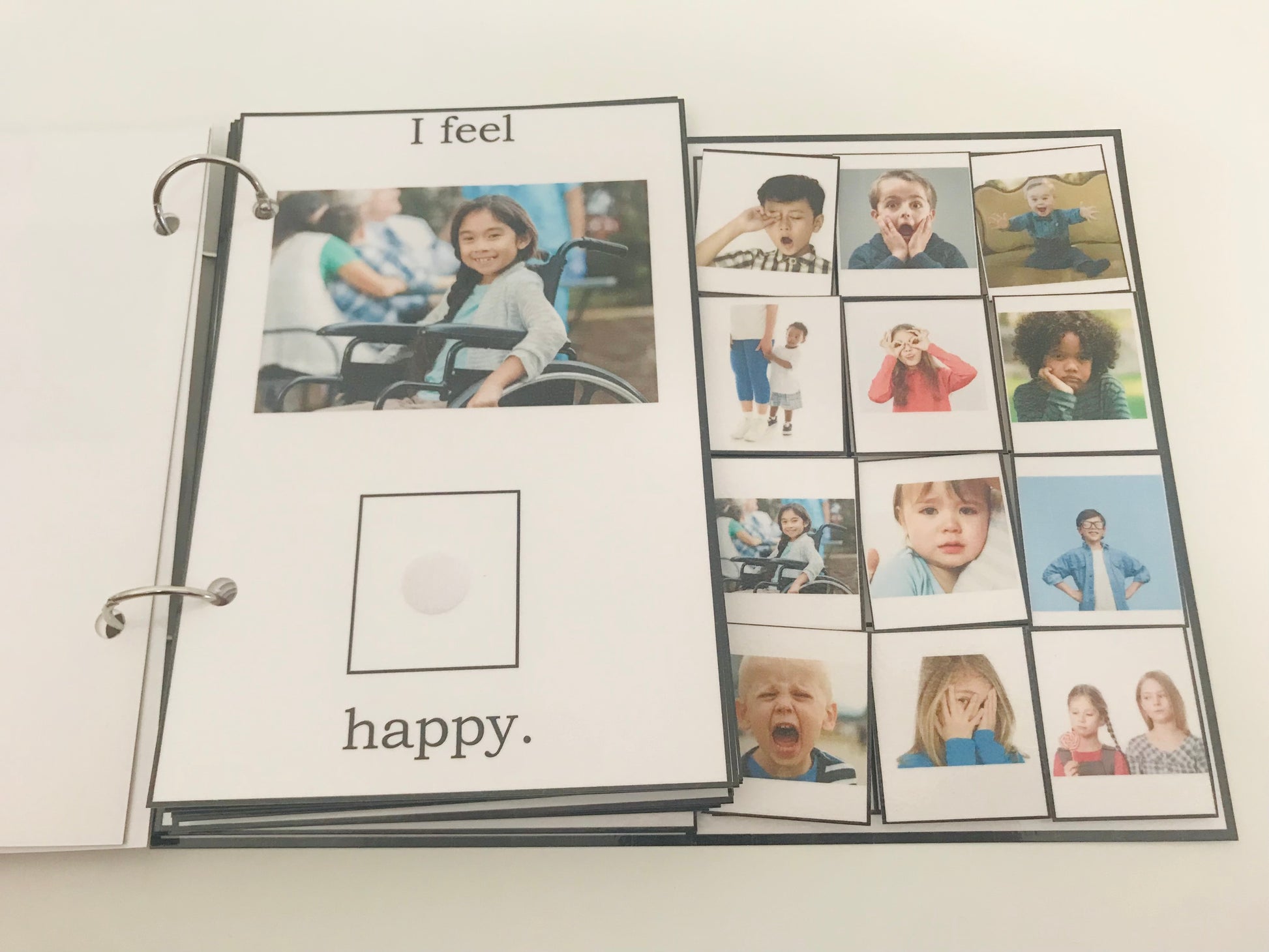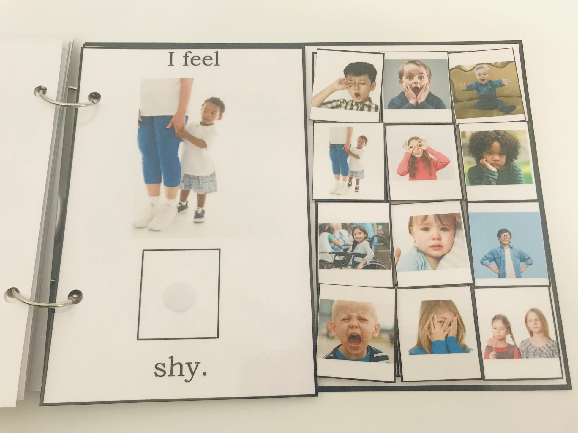 This interactive book was designed to help your child be able to identify different emotions that they feel and develop early reading skills. The book has repetitive language and a picture on each page for matching. The book comes fully laminated and assembled. The pieces connect with Velcro dots, and it is bound with metal rings.