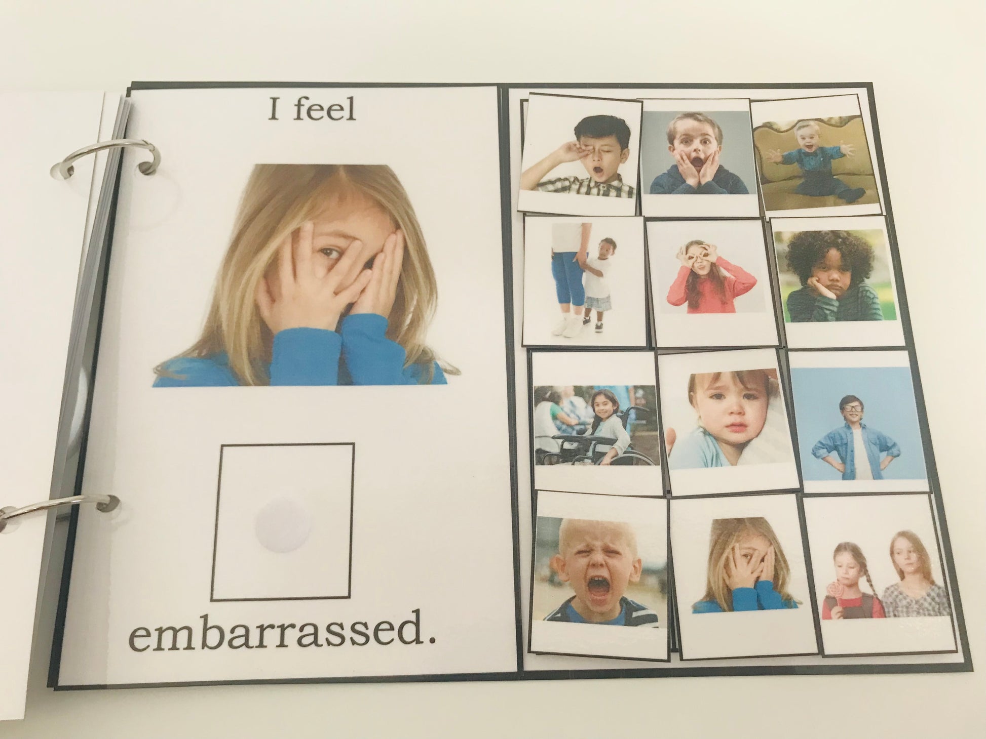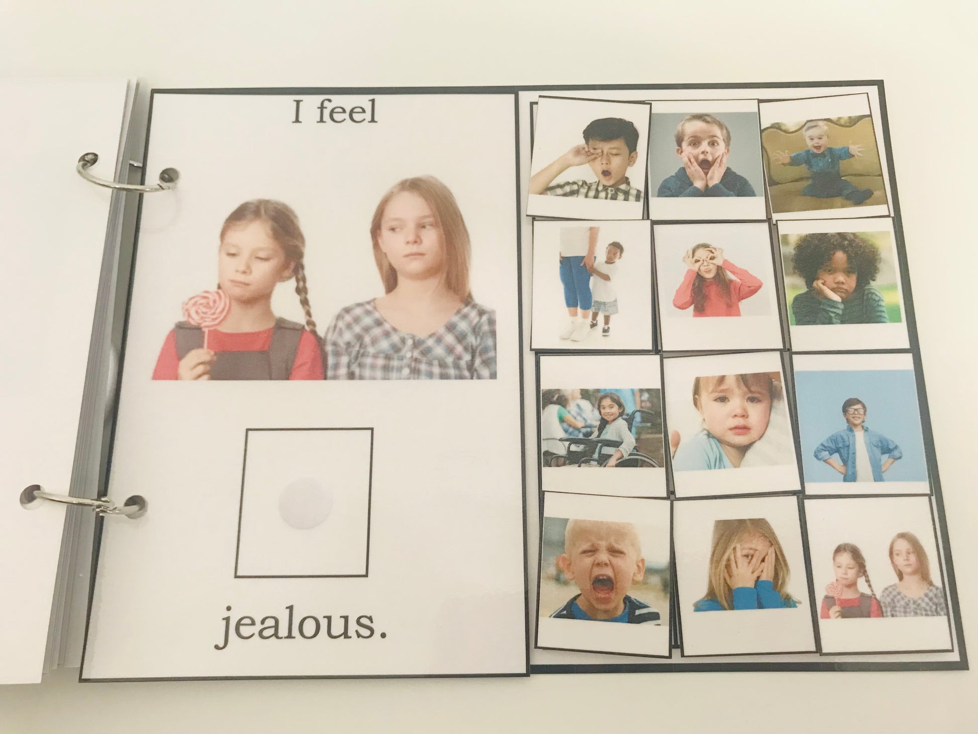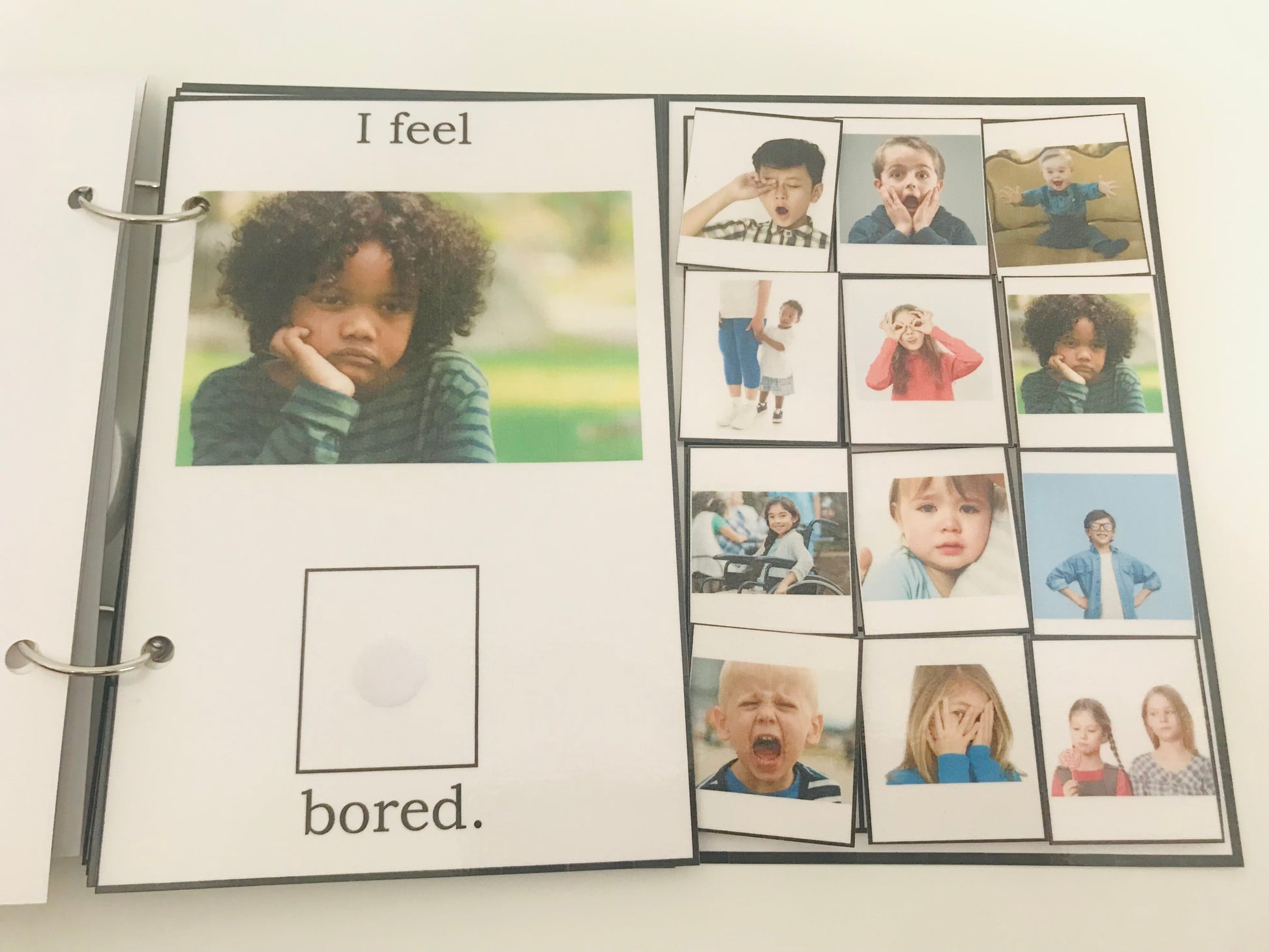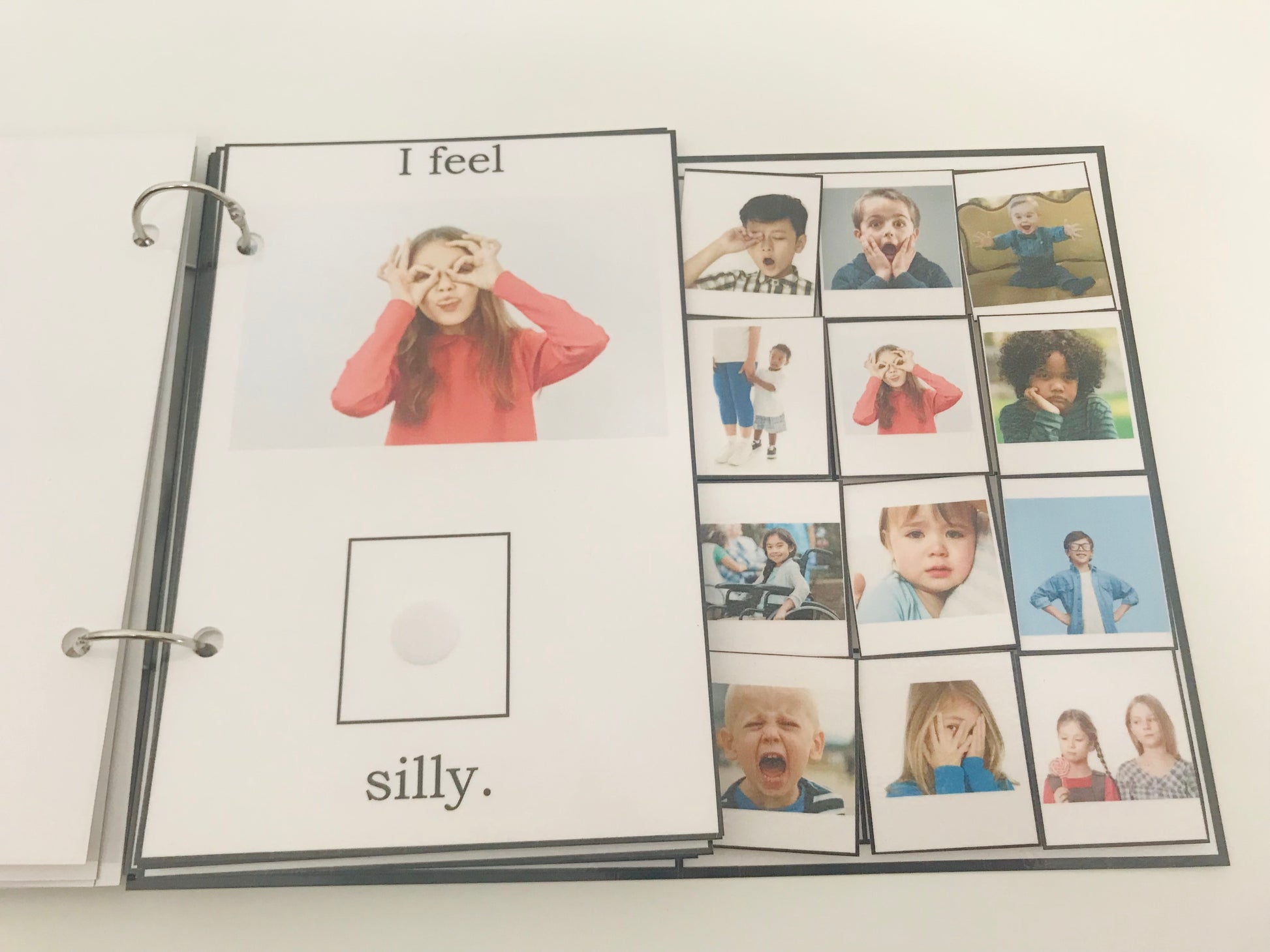 This interactive book was designed to help your child be able to identify different emotions that they feel and develop early reading skills. The book has repetitive language and a picture on each page for matching. The book comes fully laminated and assembled. The pieces connect with Velcro dots, and it is bound with metal rings.