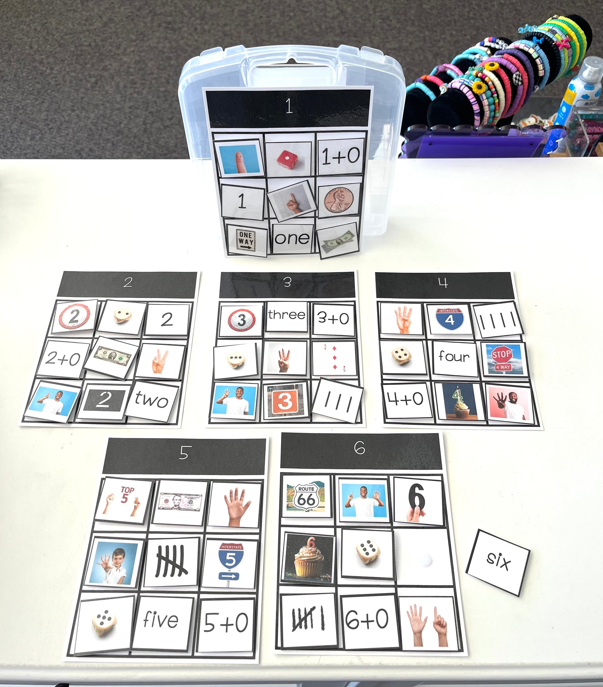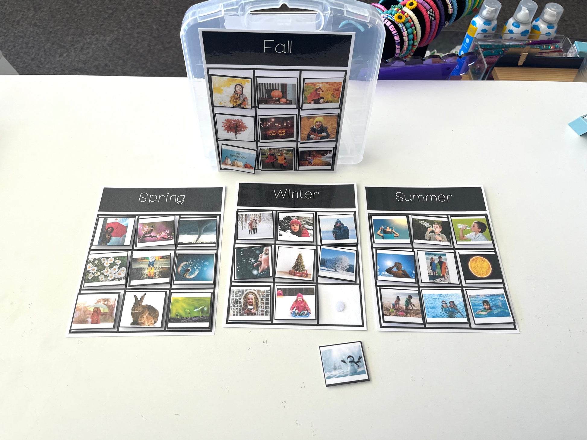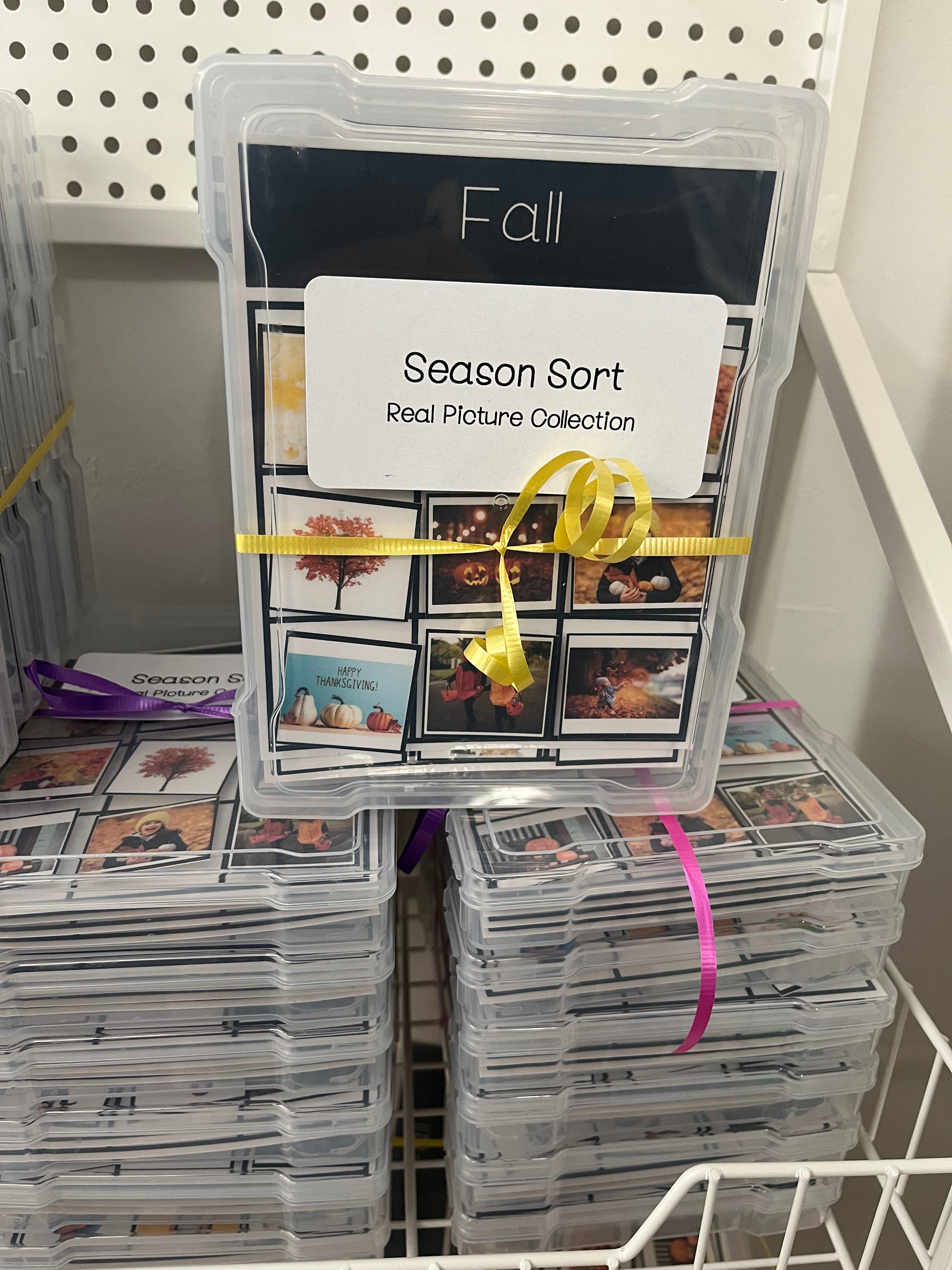 Each sort comes in a plastic 5x7 container and is labeled. Cards are laminated card stock and pieces attach with velcro dots. Hopefully this will make for a durable and long lasting activity.