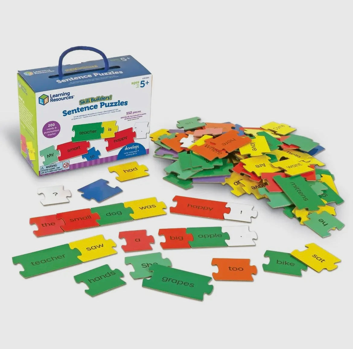 This fun kindergarten learning toy turns makes building letter and language skills as easy as solving a puzzle! Kids learn school-ready sentence skills with the Skill Builders! Sentence Puzzles from Learning Resources. This educational toy’s 100 double-sided puzzle pieces comes with 200 words and punctuation marks kids need to begin building sentences, identifying parts of speech, and more. Learning puzzles grow with your kids’ skills; start with simple 2- and 3-word sentences, then work your way up to more complex thoughts. What’s the biggest sentence you can build? The Skill Builders! Sentence Puzzles set also includes 6 blank write-and-wipe puzzle cards, so kids can add their names and other favorite words to the sentence-building fun. When kids are done learning language and letters for the day, the Skill Builders! Sentence Puzzles set’s box also doubles as reusable storage for quick, easy clean-up.