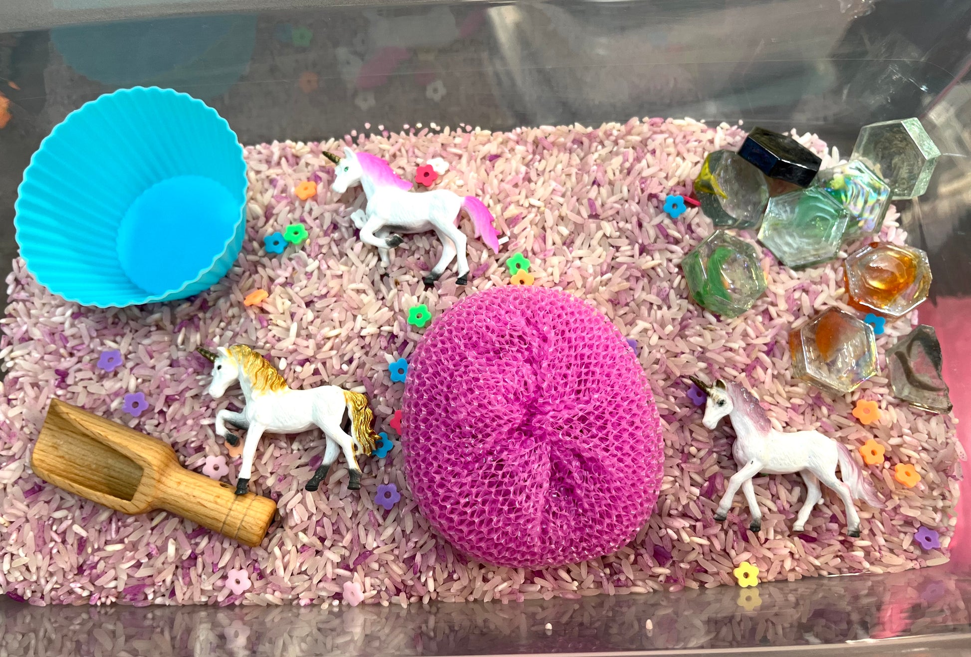 Come and explore this magical sensory bin full of colorful rice and unicorn trinkets. Scoop, dig, pour, and pretend. Color of rice varies. If you have a preference please let me know when you check out.